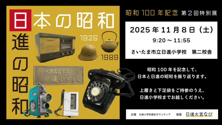 日進小学校歴史ボランティアとさいたま市立日進小学校はこのたび、企画展「日進小の150年」を開催いたします! 「日進小の1 […]