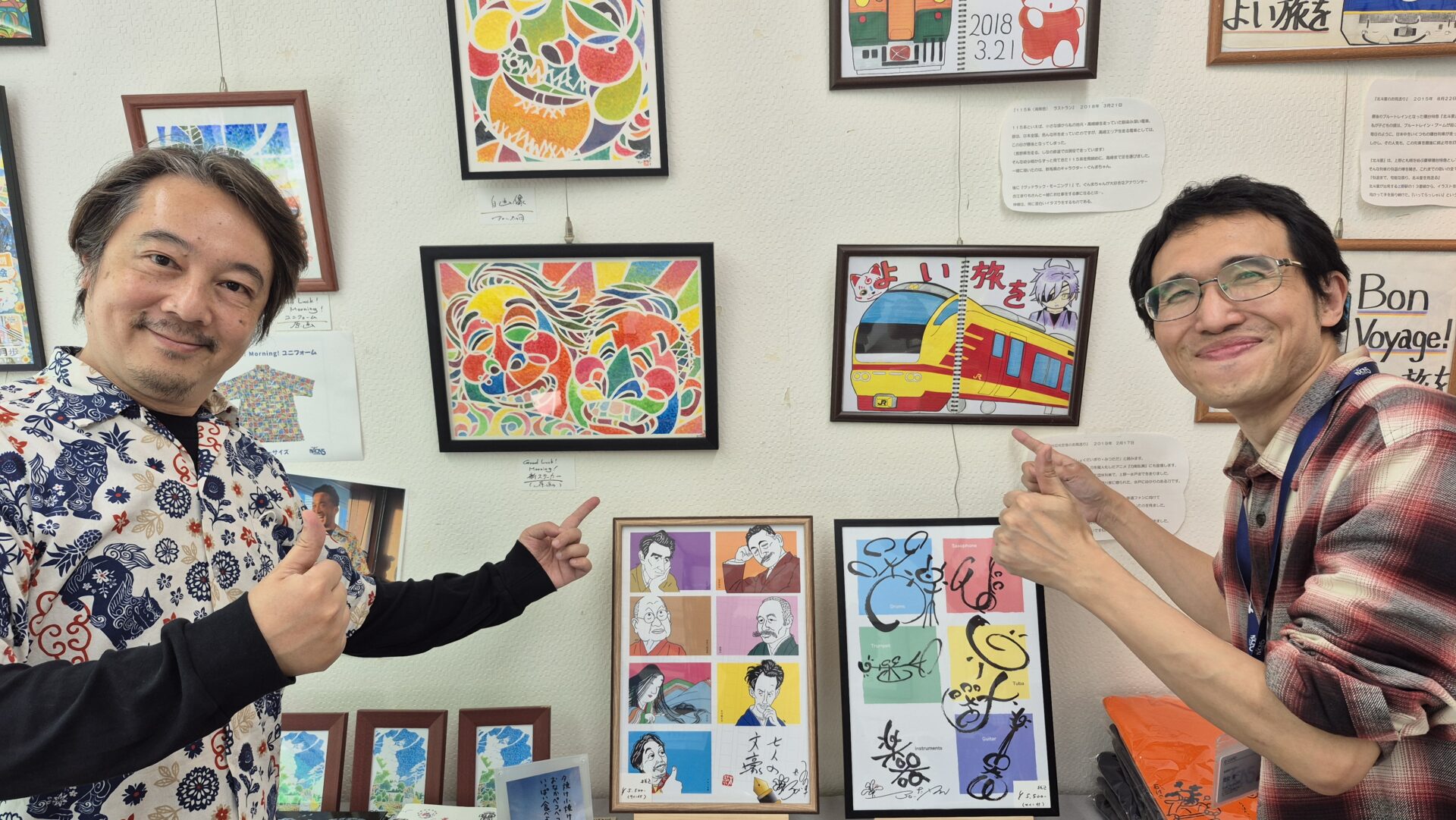 一方、ラジオパーソナリティのアロハ太朗さんの作品も同時に展示されていて、FM NACK5の番組グッズに使用されているイラストの原画が展示されています。独自に考案した「ぽんぽん版画」の技法を用いて制作されたイラストについて、アロハ太朗さんは「79.5億円でお売りします!」と冗談交じりに語りました。