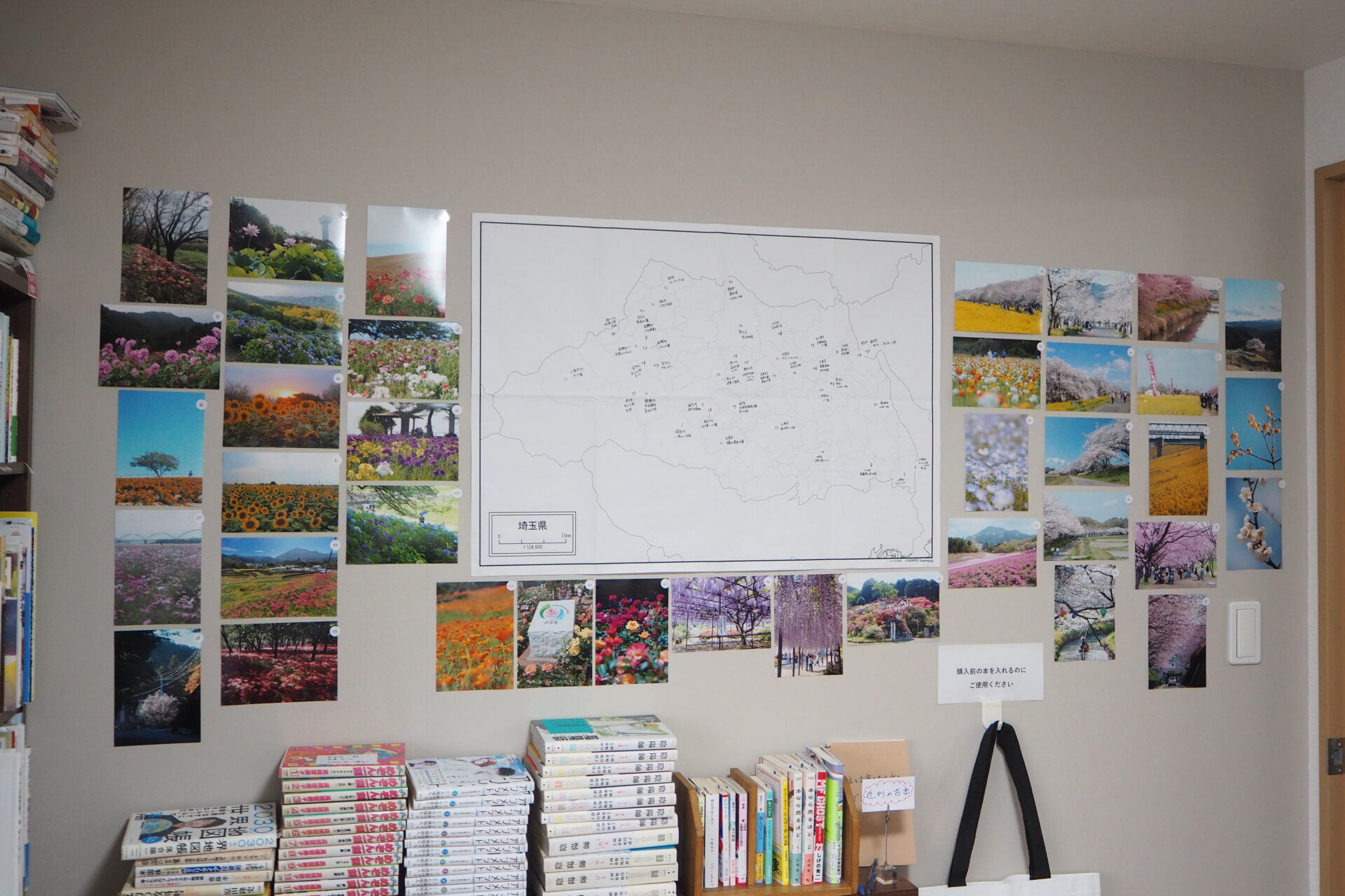 書店の壁面には地図とともに埼玉県中の花の写真が! どれも素敵な写真ですね。