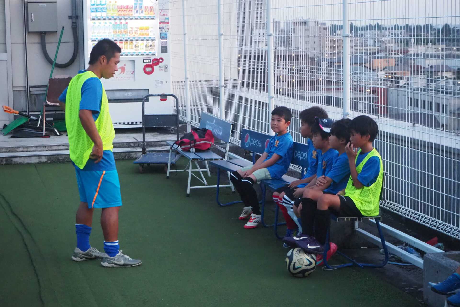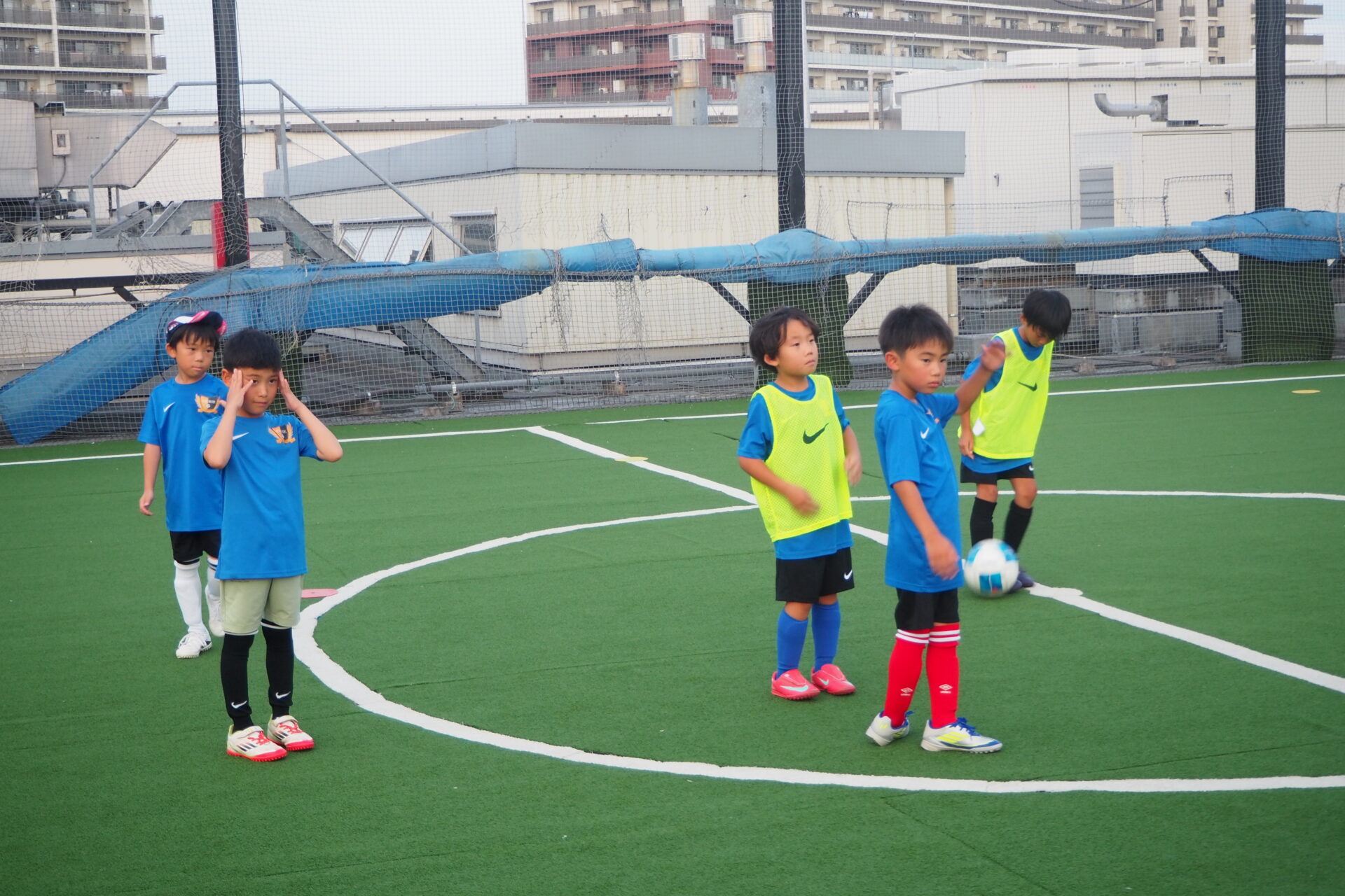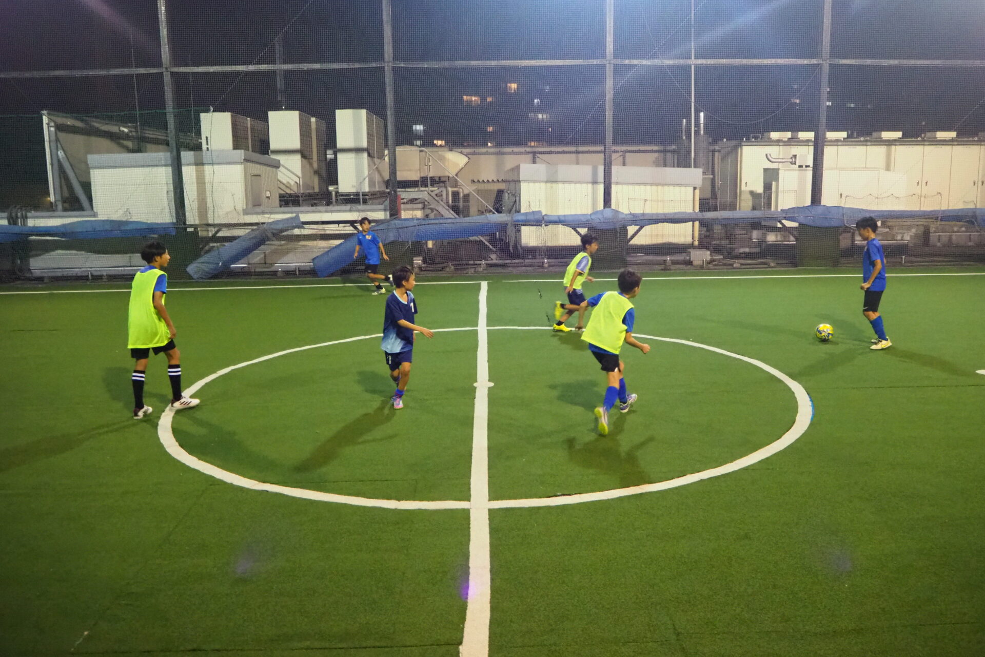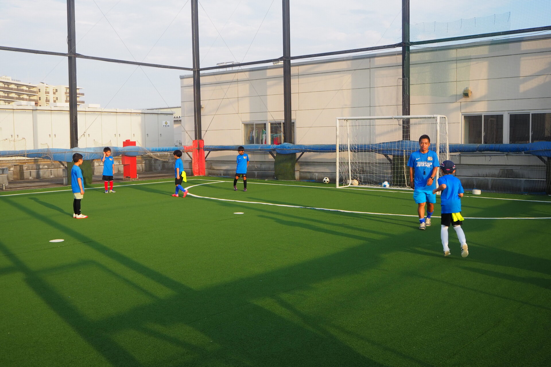 練習場のフルマークスポーツパーク大宮は、ヨークマート日進店を核テナントとする「istα!日進」の屋上にあるフットサルコート。西日が差す中、練習開始です。