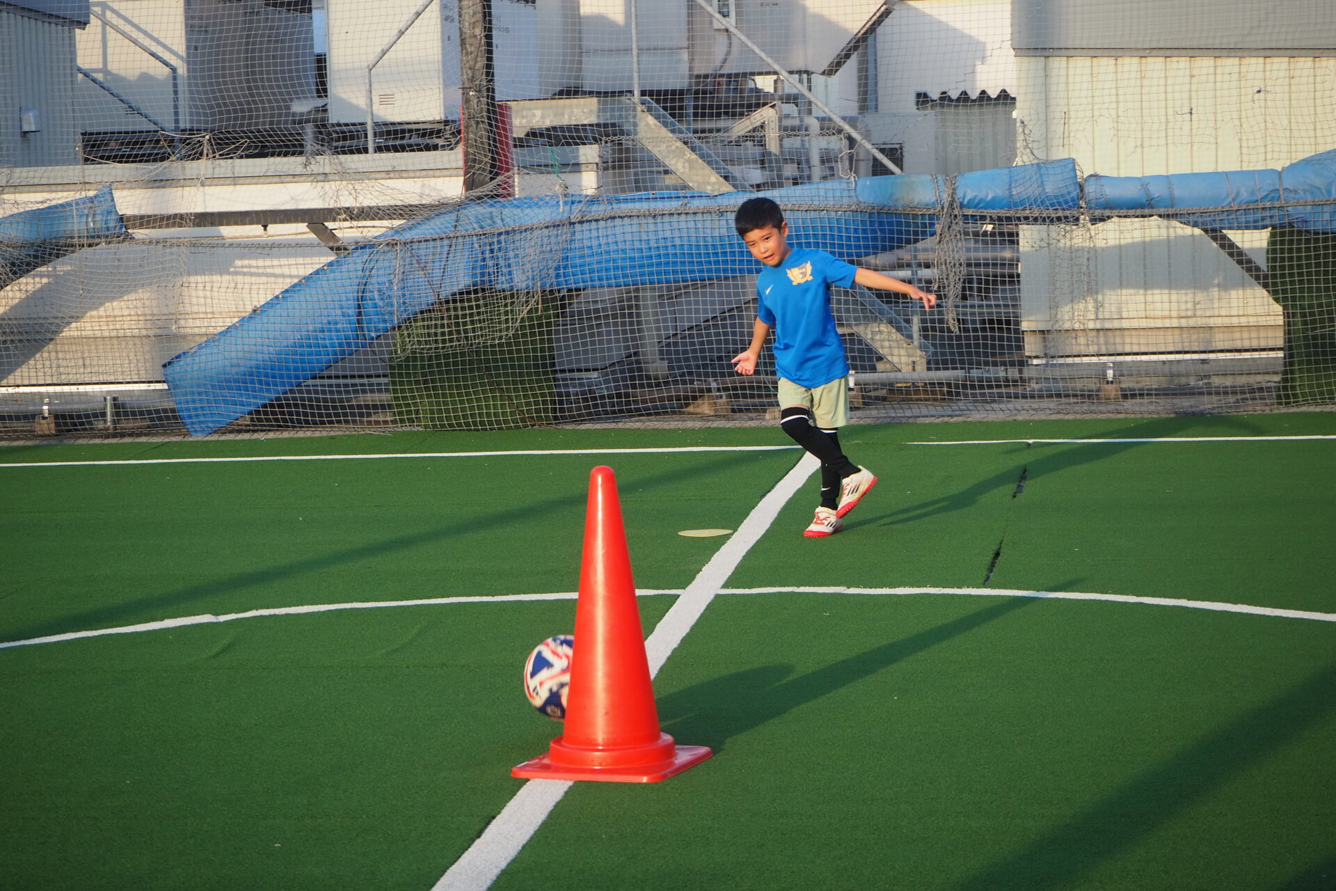 ボールを蹴り、数メートル先のカラーコーンを倒します!