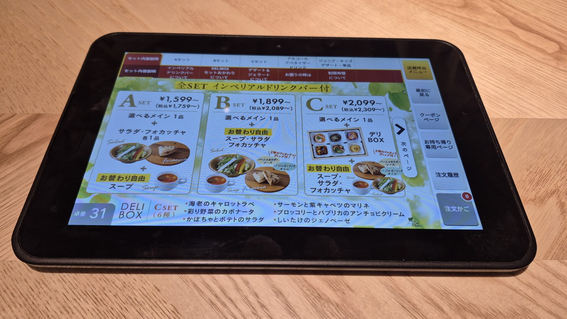 注文はタッチパネルから。いずれもディナー・土休日価格で税込1759円から楽しめるAセット、税込2089円からのBセット、税込2309円からのCセットが選べます。