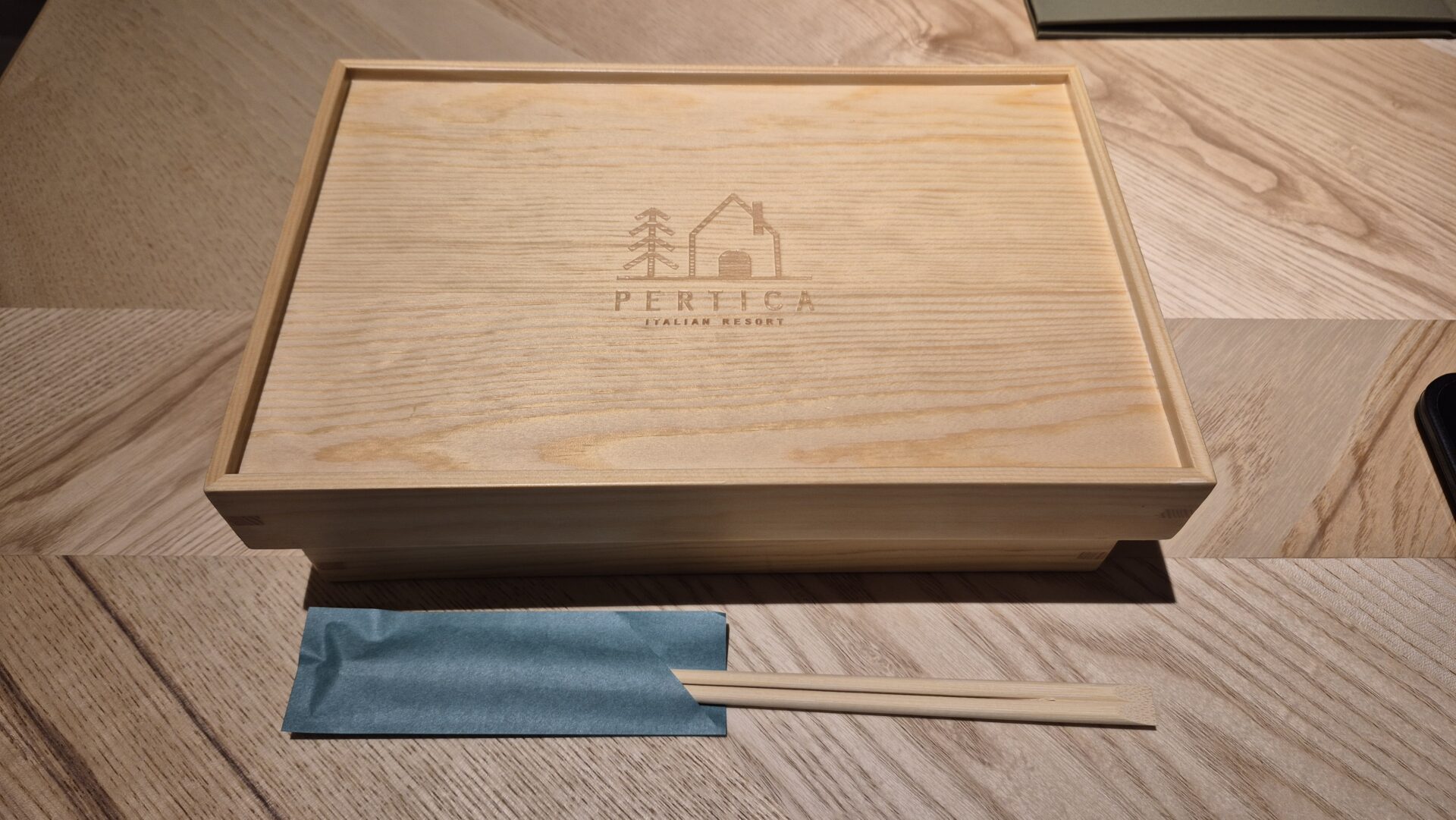 ロゴ入りのおしゃれな木箱に6つの前菜が入っています。