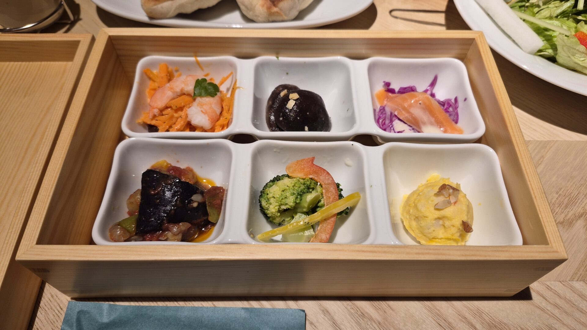中央下の「ブロッコリーとパプリカのアンチョビクリーム」は、ブロッコリー特有の苦みや臭みも全くなく、温野菜ながらシャキシャキ感も感じられるちょうどいい茹で具合でおいしいです。右下の「かぼちゃとポテトのサラダ」も最高!