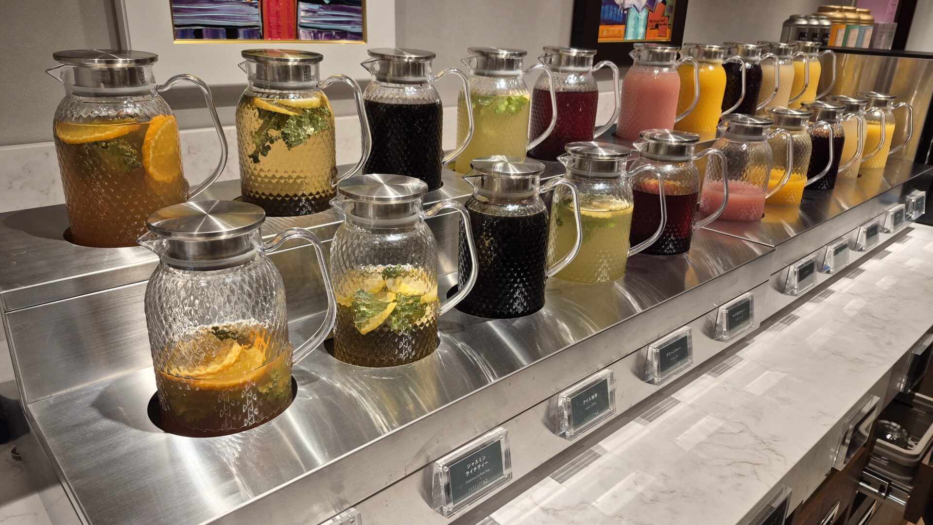 こちらが全長約12メートルもあるドリンクバー! アイスコーヒーなどの定番ドリンクのほかに、グァバやマンゴー、ピーチなどのフルーツジュースも。これは迷いますね・・・!