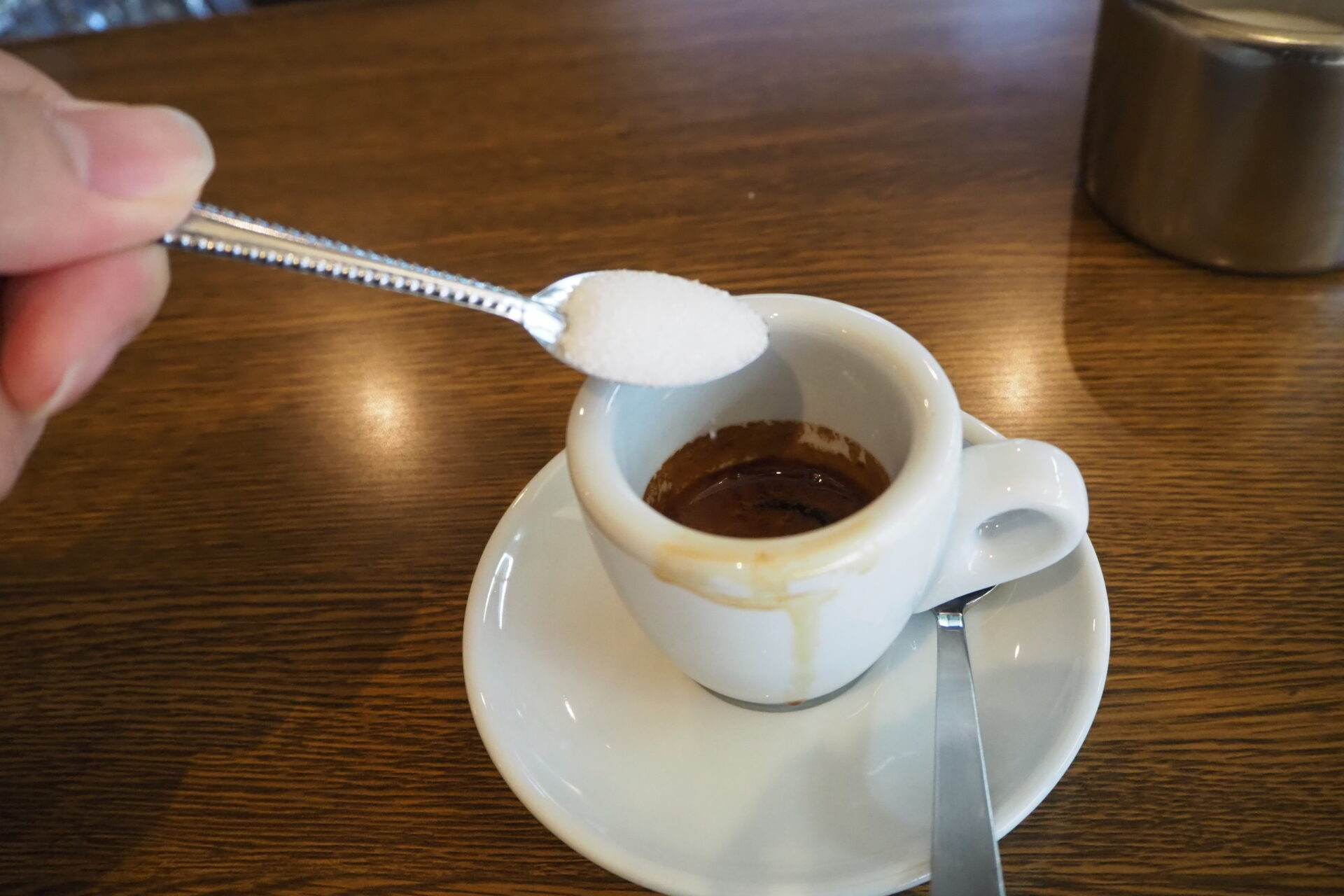 一口飲んでそのコクを味わったら、次はお砂糖をスプーン2杯ほど入れます!